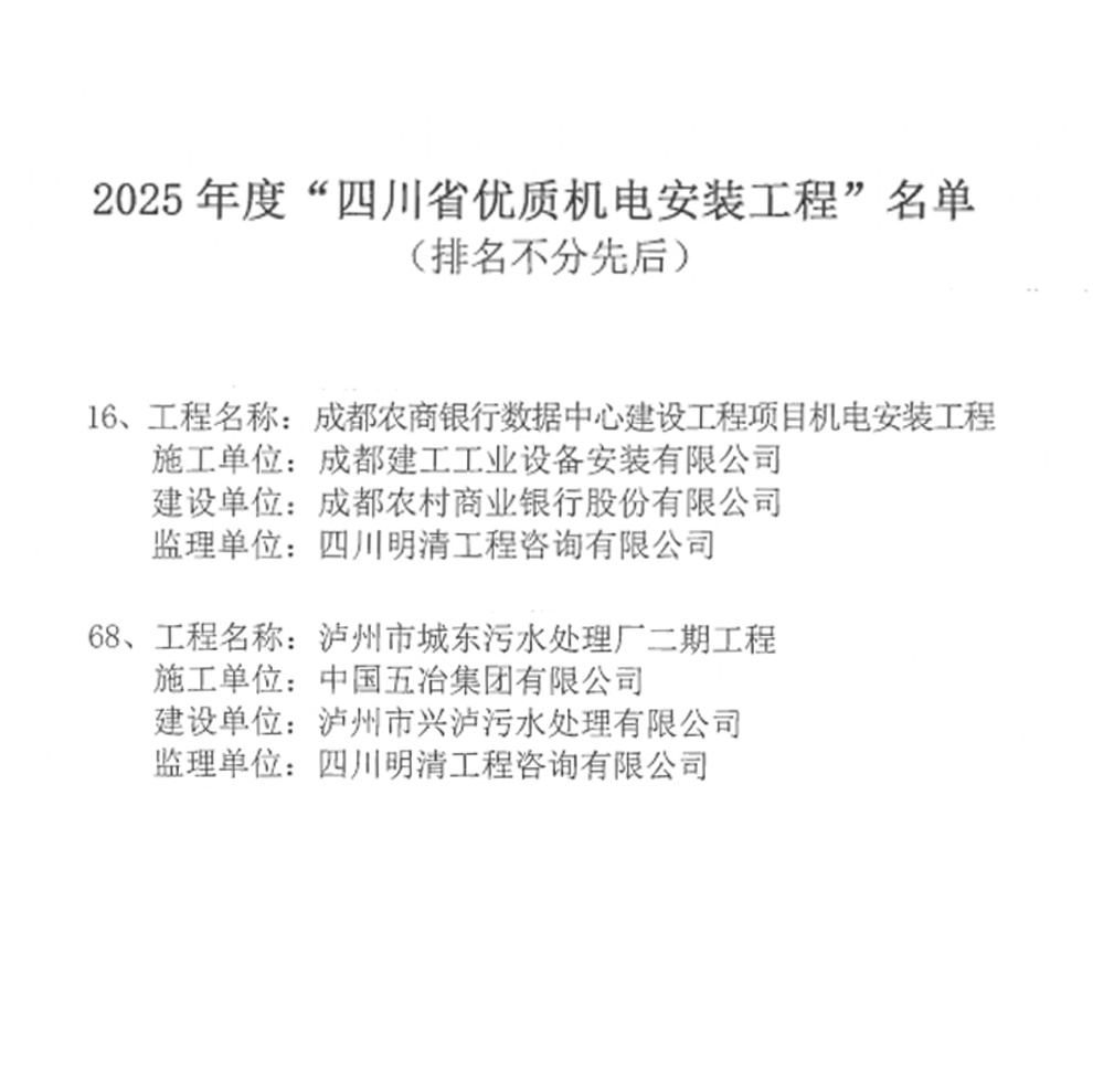 近日,四川省建筑業協會2025年度“四川省優質機電安裝工程”評選結果揭曉。由明清咨詢提供監理服務的成都農商銀行數據中心建設工程與瀘州市城東污水處理廠二期工程,憑借過硬的工程質量和卓越的系統性能,雙雙榮登榜單。